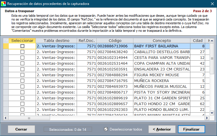 A continuación, en el tercer paso, se muestran los registros recuperados y que no existen en WinPYME. Estos registros se añadirán a la tabla de destino sin más. También tiene la posibilidad de indicar cuáles desea pasar y cuáles no, así como editar manualmente los registros antes de pasarlos.