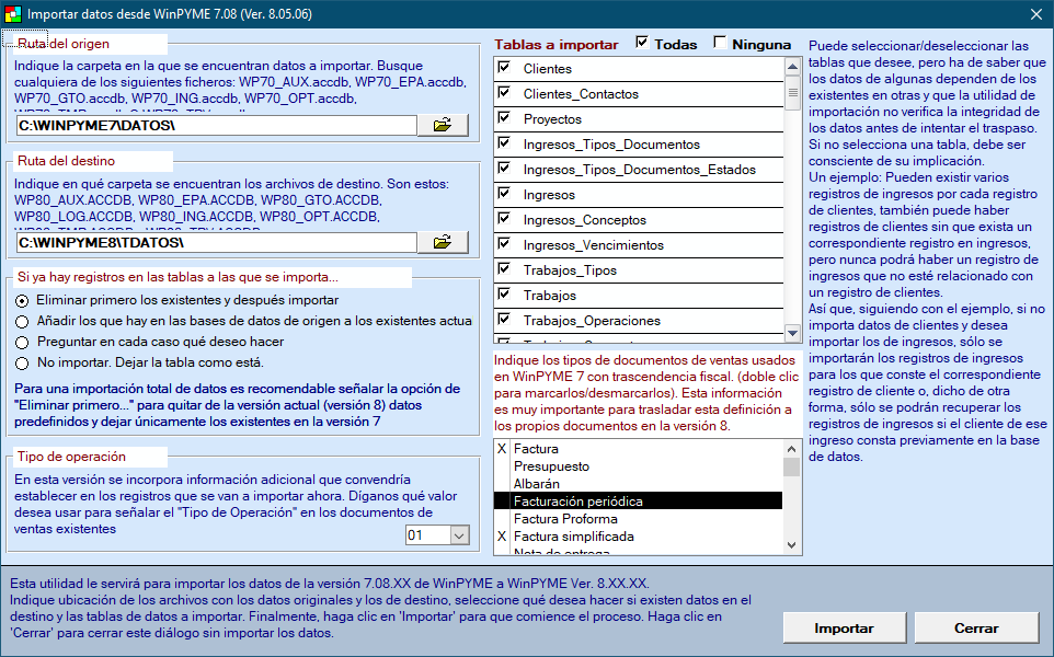 A) Descargas e instalas la versión 8 B) Importas los datos de la versión 7 a la 8 C) Descargas e instalas la versión 9 D) Importas los datos de la versión 8 a la 9 Es importante que sepas que cada versión trabaja con sus juegos de datos, de tal forma que una vez hecha la importación de una versión a la otra, los datos de origen no se pierden; en ese momento, tendrás la misma información en dos juegos de datos distintos; cada versión accede a su juego de datos. Hay que tener en cuenta también que el proceso de importación, dependiendo de la cantidad de datos, puede ser lento. Para algunas tablas se requiere hacer ciertas operaciones para la conversión. Se detalla a continuación cada uno de los cuatro puntos: A) Descargas e instalas la versión 8 La descarga de la versión 8 la has de hacer desde www.winpyme.com/descargas.html. Una vez descargado, sólo has de seguir los pasos del asistente para la instalación (en general, aceptar los valores por defecto del asistente) B) Importas los datos de la versión 7 a la 8 Para la importación de datos (www.winpyme.com/manual-v8/utilidades-importar-datos.html), abres la versión 8 de WinPYME y vas al menú Utilidades->Importar->Desde WinPYME V7. Se presentará el siguiente diálogo: ![]() Principales aspectos a considerar: